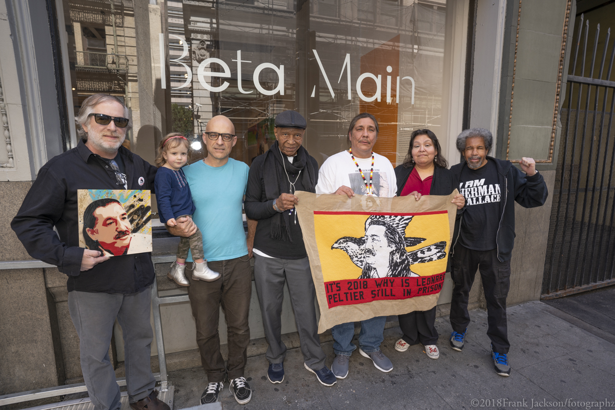 (LEFT TO RIGHT: Peter Clark, Rigo 23 with his daughter, Robert King, Chauncey Peltier, Kathy Peltier, and Albert Woodfox)