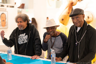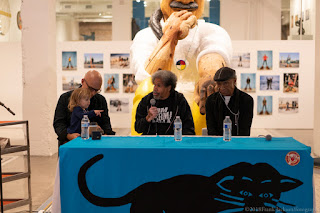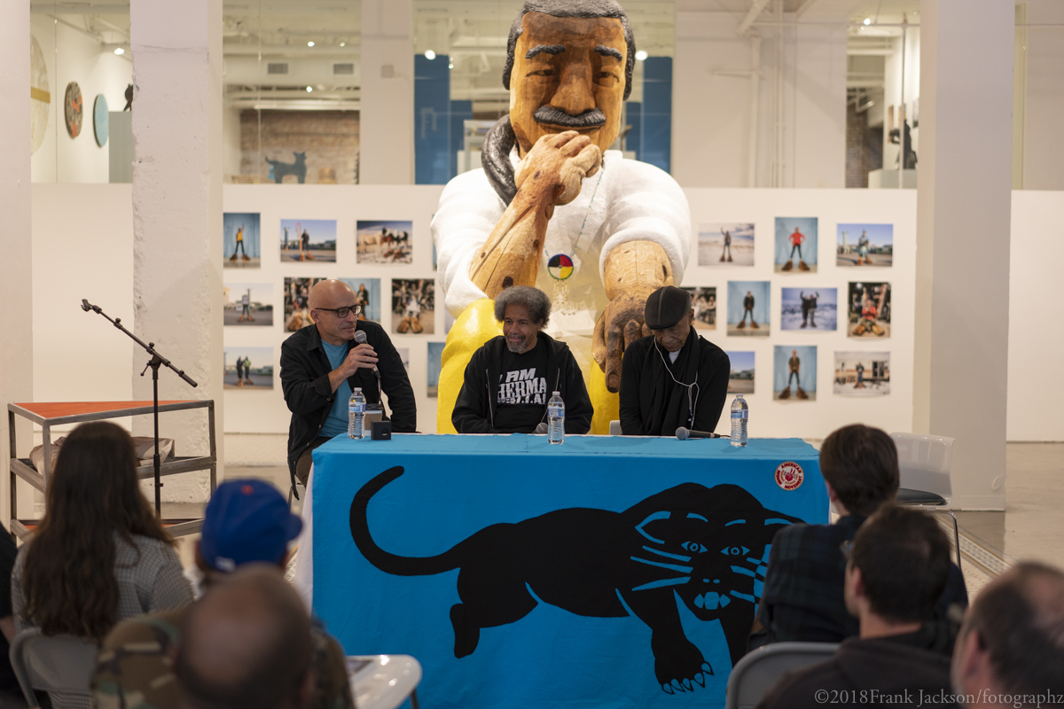 The panel discussion was held inside the exhibition supporting Leonard Peltier, entitled 'Rigo 23: Ripples Become Waves,' which takes its title from a quote by Robert King: "You throw pebbles into a pond, you get ripples; ripples become waves; the waves can become a tsunami."